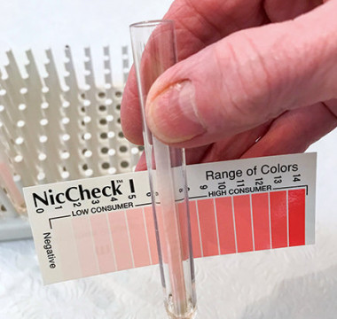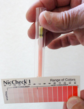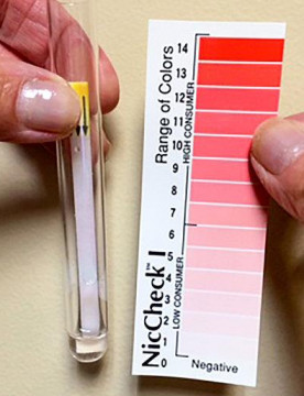 Comparison of the color developed on the strip to the color card provided will provide a semiquantitative measurement of a person’s true smoking status. NicCheck is able to determine a low consumer of nicotine from a high consumer.